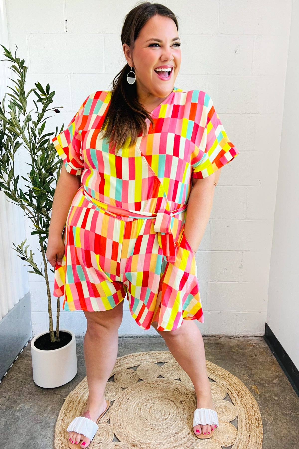 Highlight your fun side with this geometric abstract print surplice flared shorts romper with an elastic waist and tie belt. A beautiful drape and side pockets complete this stunning style.